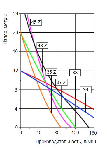 Рис. 1. Производительность бочковых насосов Flux с разным диаметром рабочего колеса и электродвигателя FLUX F 457EL_n-v (действует для всех материалов насосов).