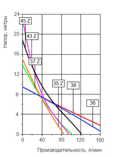 Рис. 1. Производительность бочковых насосов Flux с разным диаметром рабочего колеса и взрывозащищенного электродвигателя FLUX F 460 EX (действует для всех материалов насосов).