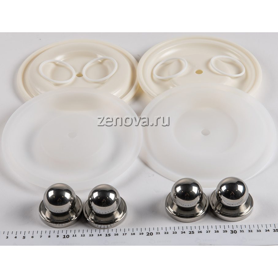 2 мембраны PTFE, 2 мембраны Hytrel, 4 шарика и 4 седла из нержавейки, 4 направляющих из фторопласта, уплотнительные кольца из PTFE