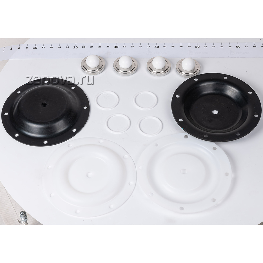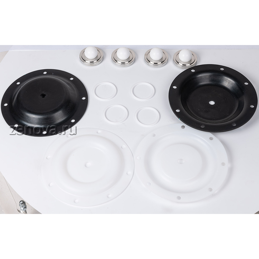 2 мембраны из тефлона, 2 мембраны из неопрена, 4 шарика из тефлона, 4 седла из нержавеющей стали, уплотнения по запросу