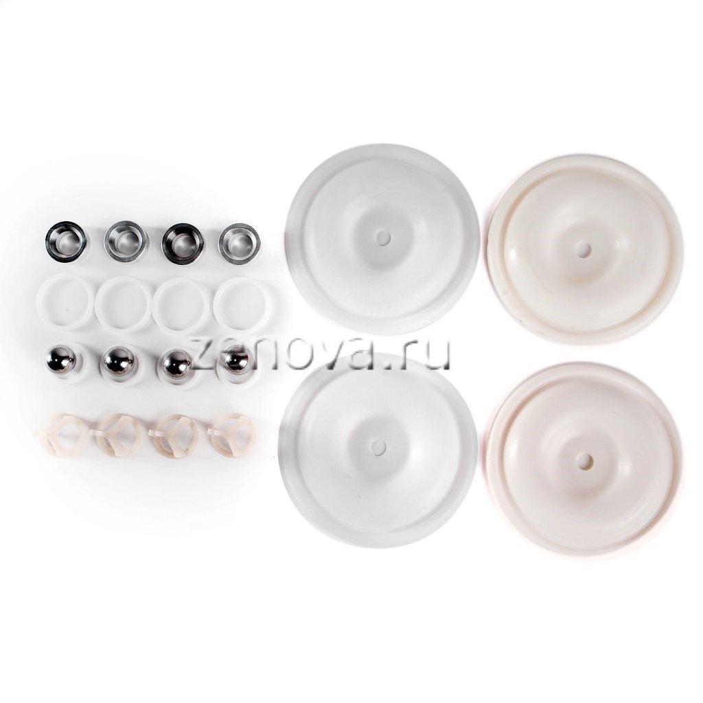 2 мембраны PTFE, 2 мембраны Hytrel, 4 шарика из нержавейки, 4 седла из алюминия, 4 направляющих из фторопласта, 8 уплотнительных колец PTFE