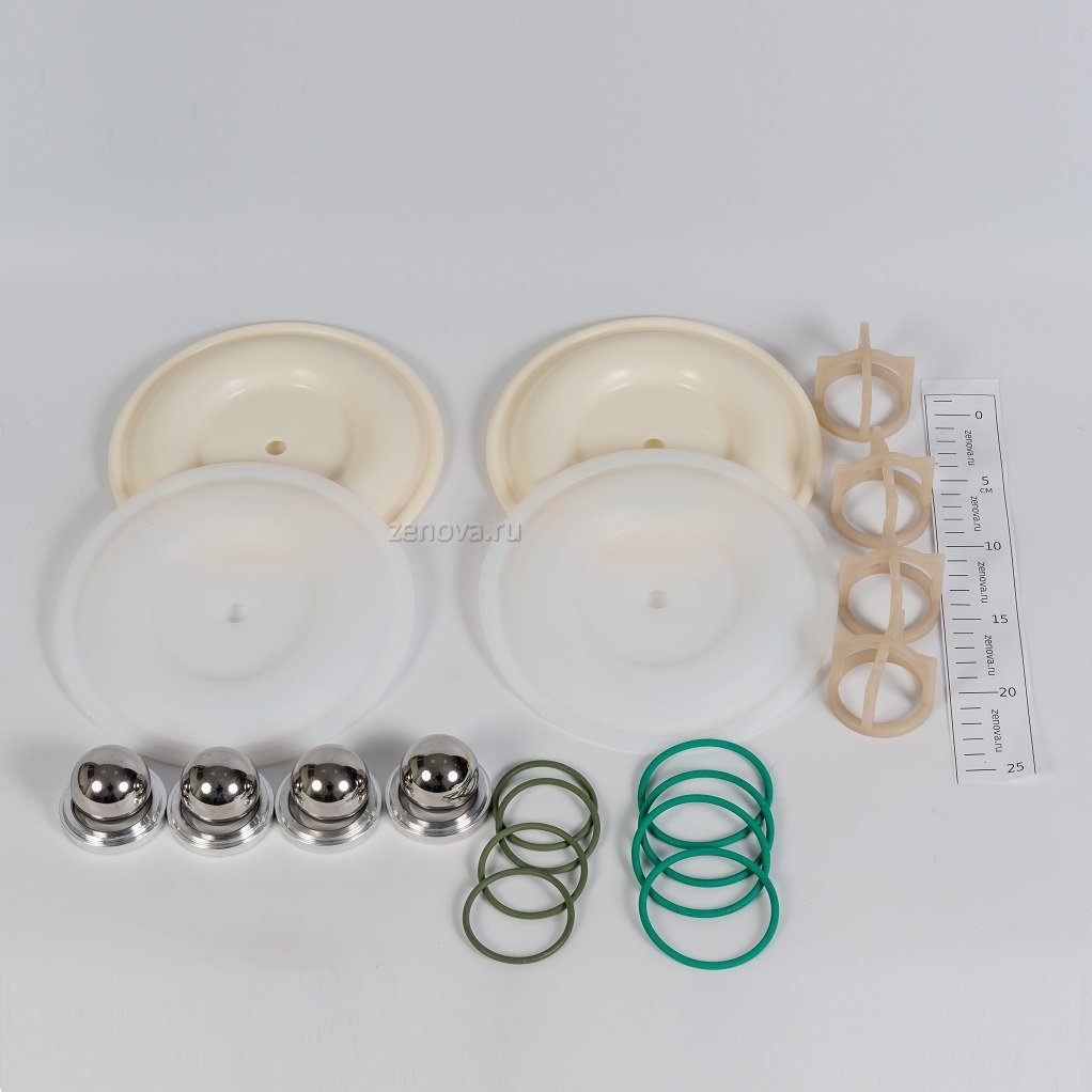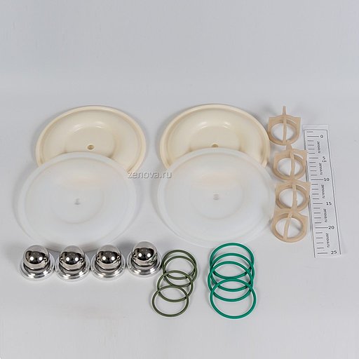 2 мембраны PTFE, 2 мембраны Hytrel, 4 шарика из нержавейки, 4 седла из алюминия, 4 направляющих из фторопласта, 8 уплотнительных колец Viton