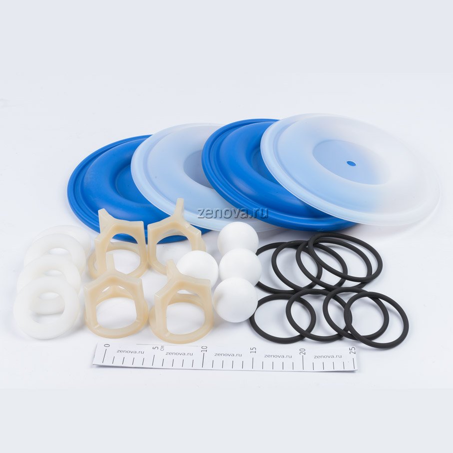 2 мембраны PTFE, 2 мембраны Santoprene, 4 шарика PTFE, 4 седла и 4 направляющих из фторопласта, 8 уплотнительных колец Viton