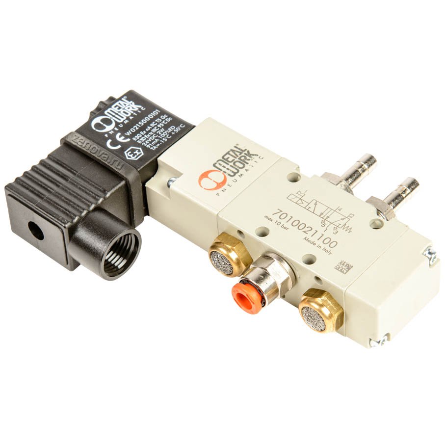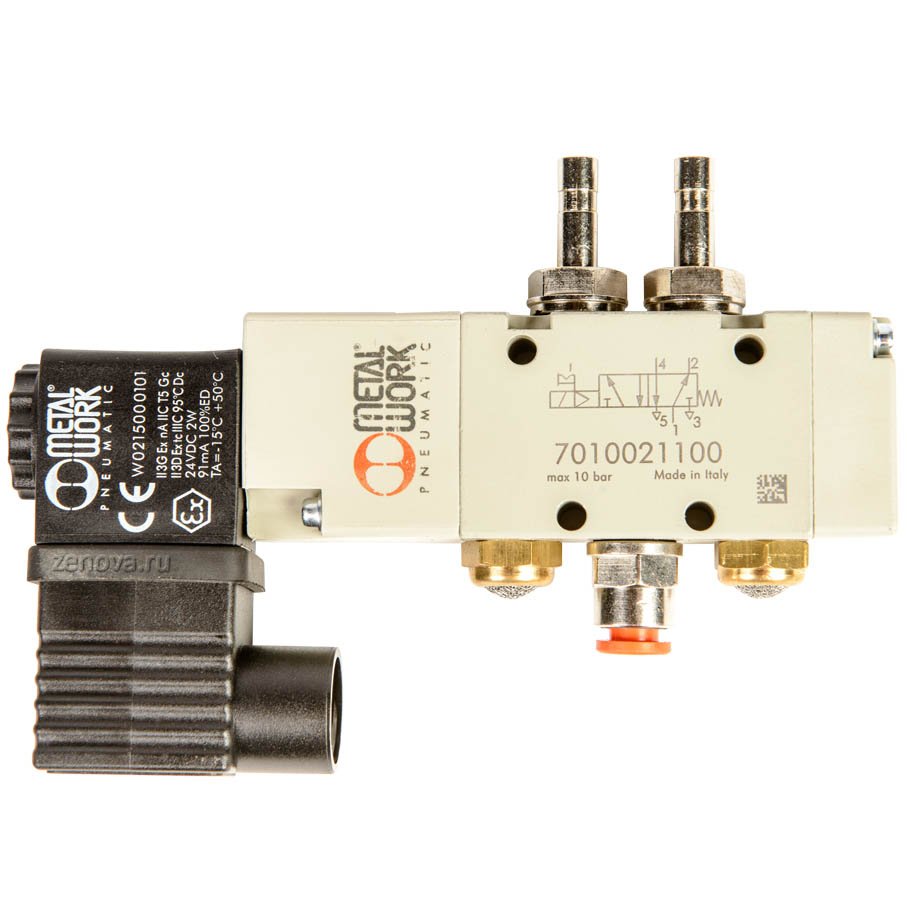 Соленоидный клапан подключается к мембранному насосу Duotek в специальном исполнении (у насоса должно быть 2 отверстия под воздух). Клапан питается от источника постоянного тока 24В, управление происходит при помощи контрольной панели.
