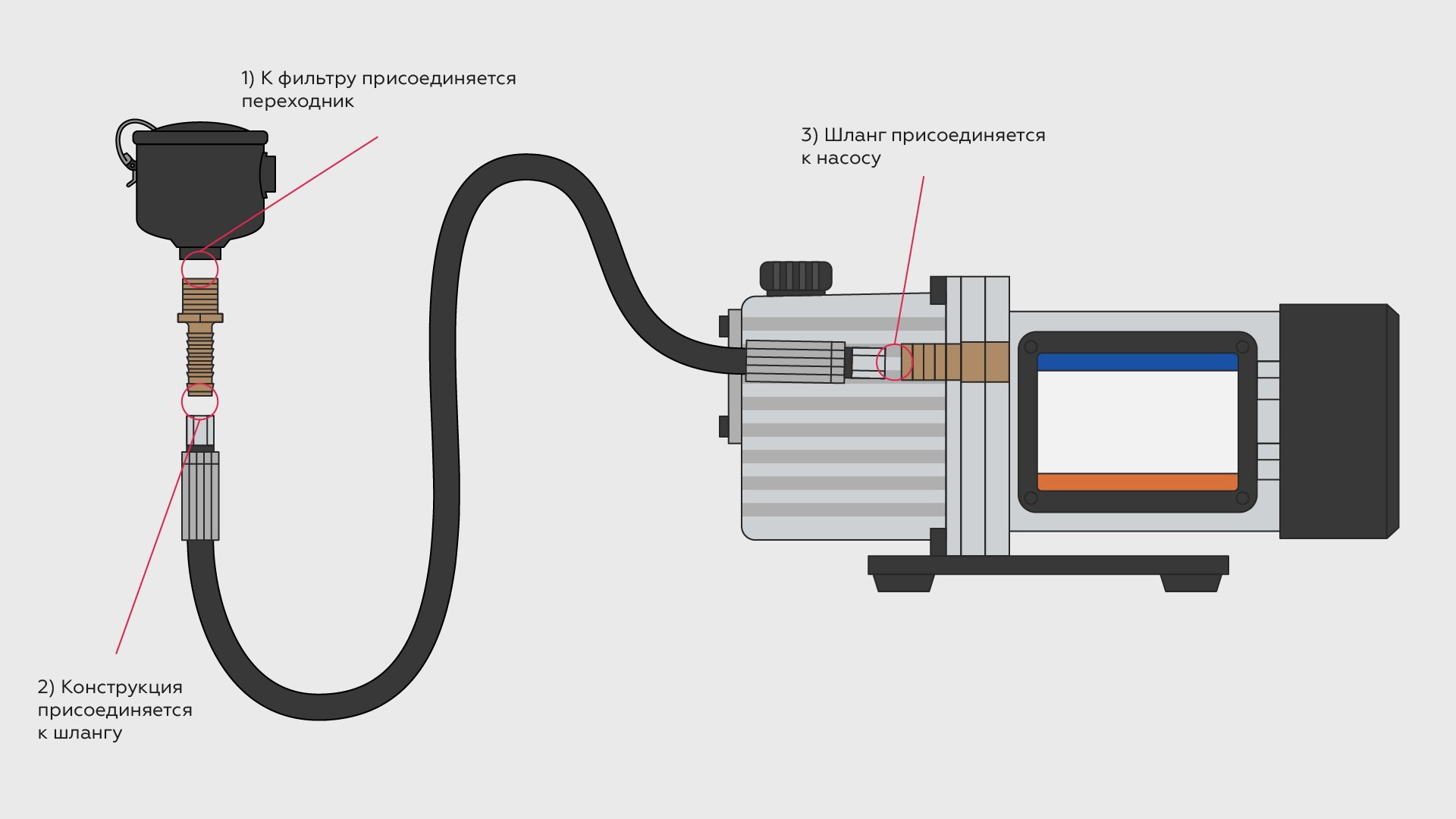 Чтобы подключить воздушный вакуумный фильтр к насосу Value VSV вам понадобятся шланг, переходник, хомуты, сантехническая паста. Схема подключения изображена ниже: