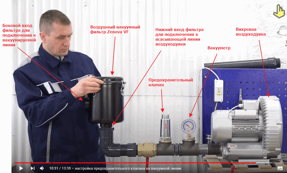 Фильтр имеет 2 входа: снизу и сбоку. Боковой вход нужен для подключения к вакуумируемой линии, а нижний вход - для подключения к всасывающей линии воздуходувки (вакуумного насоса).