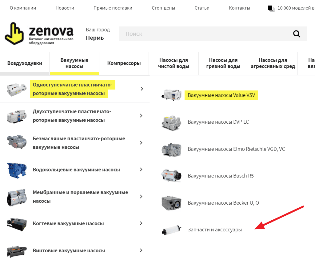 Изображение 1. Для каждой категории, где товары имеют запчасти, теперь автоматически формируется страничка "Запчасти и аксессуары", куда можно попасть через главное меню. На приведенном изображении показана ссылка на страницу с запчастями для Одноступенчатых пластинчато-роторных вакуумных насосов.