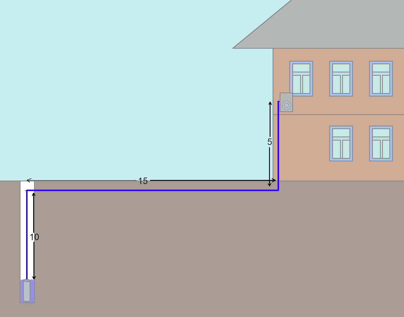 Допустим, мы хотим подобрать насос для двухэтажного дома. Нам нужно, чтобы на втором этаже могла работать стиральная машина, для которой нужно обеспечить давление в 6 м.в.ст. Источником воды будет колодец или скважина, глубиной 10 метров. Сам насос будет располагаться на уровне воды. Начертим эскиз водопровода и укажем все известные нам размеры: расстояние от скважины до дома 15 метров, расстояние от земли до места установки стиральной машины 5 метров.