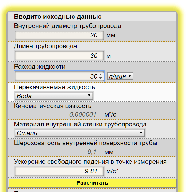 2. Калькулятор рассчитывает потери давления жидкости без учета изменения высоты труб. Подробнее об этом будет указано в конце статьи.
