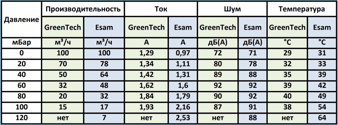 Абсолютно во всех режимах КПД воздуходувки Esam существенно выше, чем у GreenTech (за 100% КПД мы взяли наилучший результат измерений, остальные указали процентах от лучшего результата). Это значит, что на каждый потребленный кВт энергии из сети воздуходувка Esam сможет перекачать значительно больше воздуха при равном перепаде давлений. Подробнее о расчете КПД вы можете прочитать в конце этой статьи.