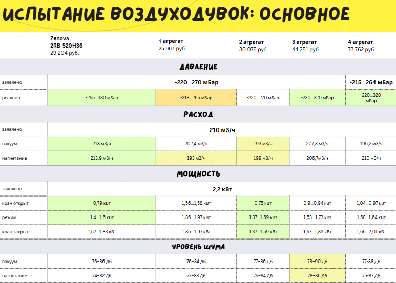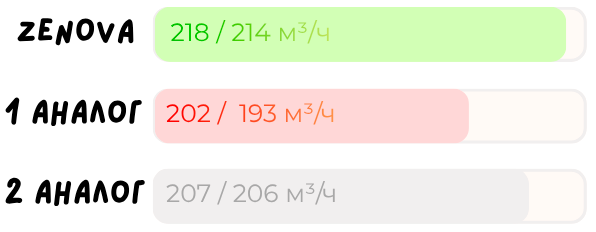 Далее нам стала интересна производительность – расход воздуха определяет, какой объем газа агрегат может переместить в единицу времени. Здесь инженерная команда провела испытание как на вакуум, так и на нагнетание – и сильно удивилась, так как четвертый вариант (самый дорогой в выборке) оказался в хвосте с показателем 196,2 м³/ч. При одинаковом энергопотреблении Zenova перемещает на 10-12% больше воздуха, чем агрегат конкурента: наша воздуходувка лидер по обоим показателям — 218 м³/ч (вакуум) и 213,9 м³/ч (нагнетание). Остальные же до заявленной отметки в 210 м³/ч не дошли.