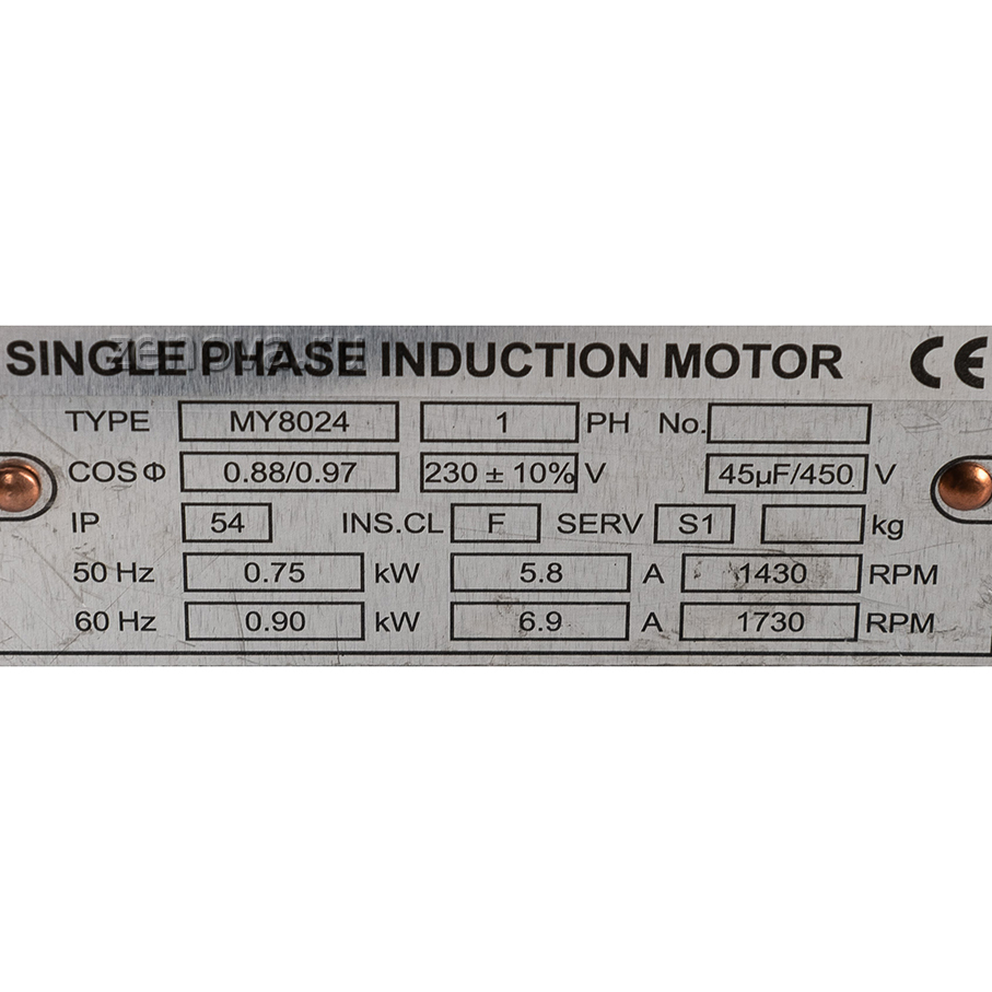 Мощность двигателя 0,75 кВт, 1460 об/мин (4Р), стандартное питание 220 В. На шильдике двигателя указана потребляемая мощность для идеальных условий работы. На практике двигатели могут потреблять существенно больше тока. Перед установкой автомата защиты рекомендуется провести контрольный пуск и измерить фактическое потребление.