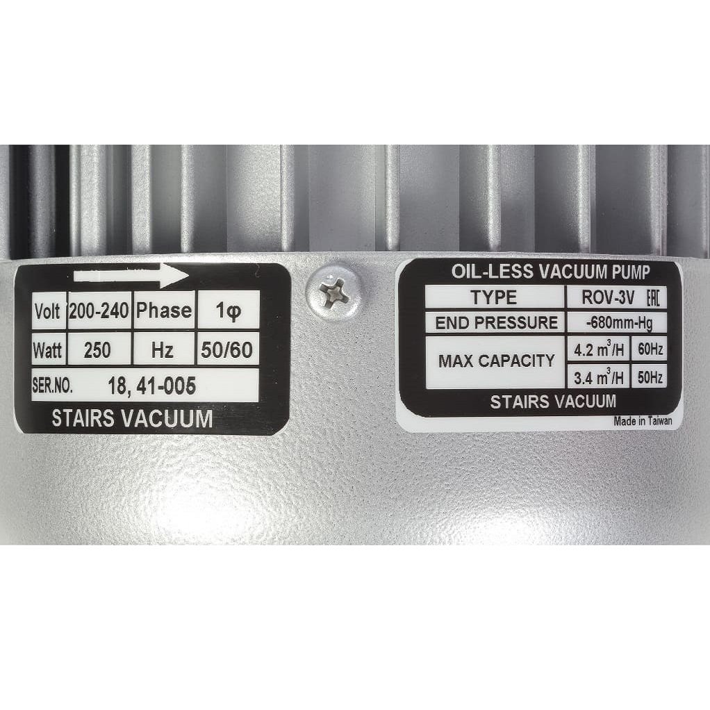 Сухой пластинчато-роторный вакуумный насос Stairs Vacuum ROV-3V_220 работает с чистым воздухом и инертными газовыми смесями. Насос способен откачать закрытый объем воздуха до остаточного давления 120 мбар. Он не требует заправки вакуумным маслом, используется в приложениях, где важно, чтобы воздух на выходе оставался чистым и безопасным. Страна производства насоса Тайвань.