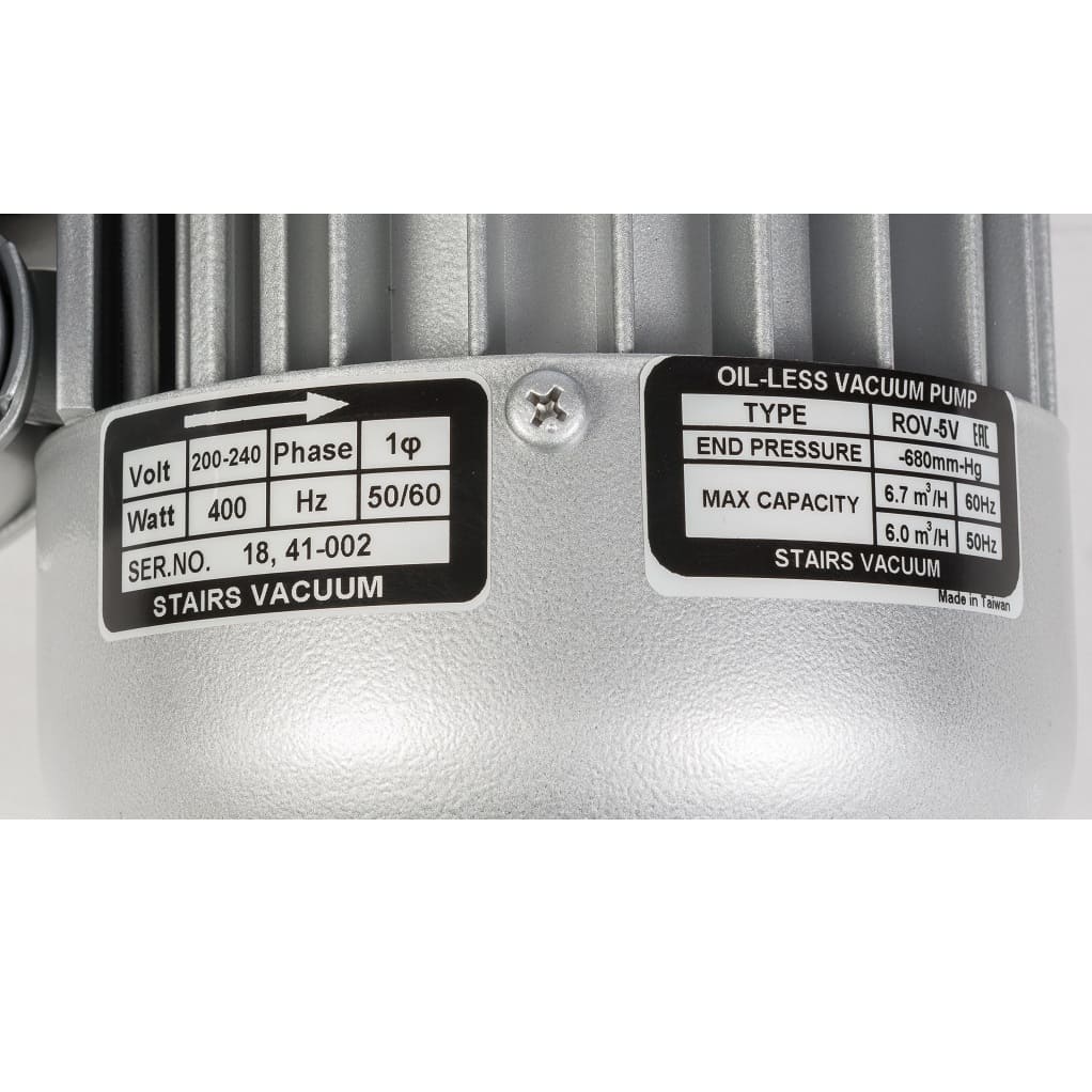 Сухой пластинчато-роторный вакуумный насос Stairs Vacuum ROV-5V_220 работает с чистым воздухом и инертными газовыми смесями. Насос способен откачать закрытый объем воздуха до остаточного давления 120 мбар. Он не требует заправки вакуумным маслом, используется в приложениях, где важно, чтобы воздух на выходе оставался чистым и безопасным. Страна производства насоса Тайвань.