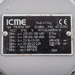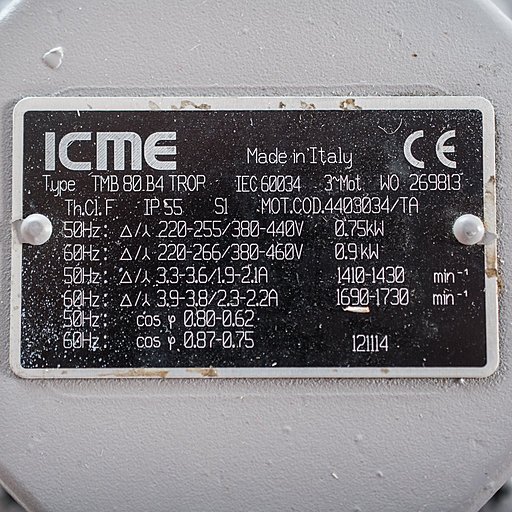 На насосе установлен трёхфазный электродвигатель (380 В) мощностью 0.75 кВт, 1400 об/мин (4Р), 50 Гц.