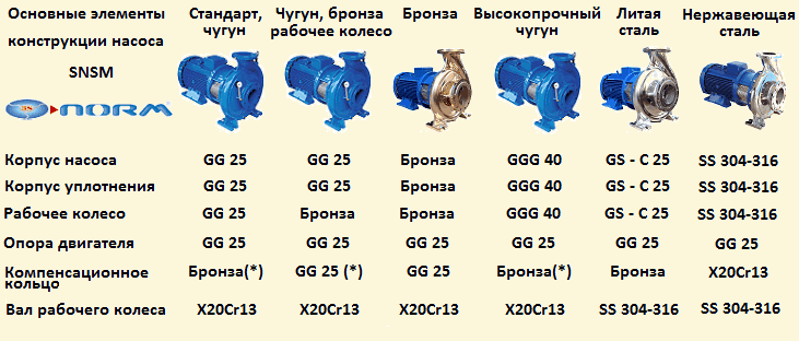 В зависимости от типа перекачиваемой жидкости, температуры и давления, насосы выполнены в шести основных вариантах исполнения по материалам: