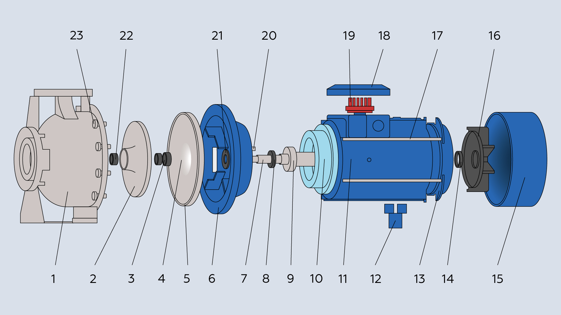 | 6. Соединение – чугун | 14. Усиленное уплотнение – NBR | 22. Гайка импеллера – оцинкованная сталь |