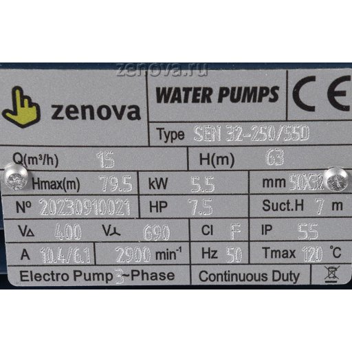 Центробежный насос Zenova SEN 32-250/55D позволяет перекачивать воду и прочие неагрессивные к нержавеющей стали жидкости. Конструкция насоса моноблочного типа с прямым присоединением двигатель-насос, патрубки фланцевые – всасывающий DN50, подающий DN32. У этой модели насоса двойное рабочее колесо из нержавеющей стали AISI 304. Стандарт фланца – DIN EN 1092-1 поверхность B тип 01 PN10, DN (диаметр) входного патрубка – 50 мм, выходного – 32 мм.