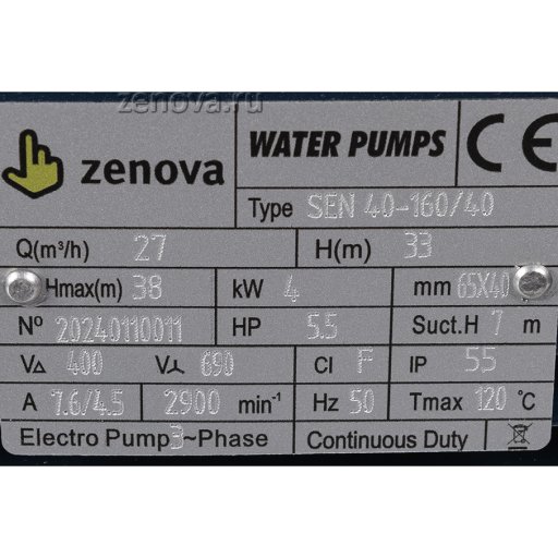 Центробежный насос Zenova SEN 40-160/40 позволяет перекачивать воду и прочие неагрессивные к нержавеющей стали жидкости. Конструкция насоса моноблочного типа с прямым присоединением двигатель-насос, патрубки фланцевые – всасывающий DN65, подающий DN40. Рабочее колесо из чугуна. Стандарт фланца – DIN EN 1092-1 поверхность B тип 01 PN10, DN (диаметр) входного патрубка – 65 мм, выходного – 40 мм.