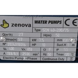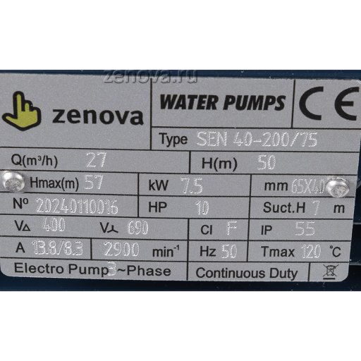 Центробежный насос Zenova SEN 40-200/75 позволяет перекачивать воду и прочие неагрессивные к нержавеющей стали жидкости. Конструкция насоса моноблочного типа с прямым присоединением двигатель-насос, патрубки фланцевые – всасывающий DN65, подающий DN40. Рабочее колесо из нержавеющей стали AISI 304. Стандарт фланца – DIN EN 1092-1 поверхность B тип 01 PN10, DN (диаметр) входного патрубка – 65 мм, выходного – 40 мм.