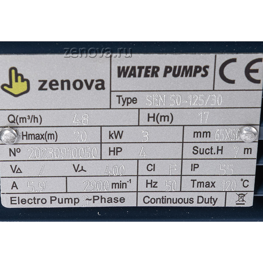Центробежный насос Zenova SEN 50-125/30 позволяет перекачивать воду и прочие неагрессивные к нержавеющей стали жидкости. Конструкция насоса моноблочного типа с прямым присоединением двигатель-насос, патрубки фланцевые – всасывающий DN65, подающий DN50. Рабочее колесо из чугуна. Стандарт фланца – DIN EN 1092-1 поверхность B тип 01 PN10, DN (диаметр) входного патрубка – 65 мм, выходного – 50 мм.