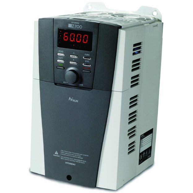 Частотный преобразователь Hyundai N700V_300HF (производство Корея) обеспечивает полное векторное (с датчиками обратной связи) управление частотой переменного тока и расчитан на самые высокие и ответственные нагрузки. Подходит для трехфазного асинхронного двигателя мощностью не более 30 кВт, номинальная выходная сила тока 58 А. Входной ток трехфазный от 342 до 528 вольт. Потери мощности при номинальной силе тока составляют 1,55 кВт, а при 70% от номинала потери составляют 1,1 кВт.