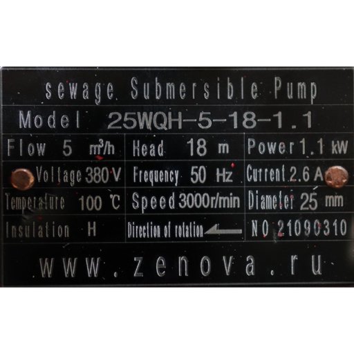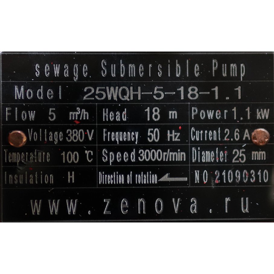 На насосе 25WQH-5-18-1.1 установлен трехфазный электродвигатель мощностью 1,1 кВт на 2900 об/мин, специально адаптированный работать при высокой температуре. Длина электрического кабеля насоса составляет 8 метров. Требуемое подключение — звезда.