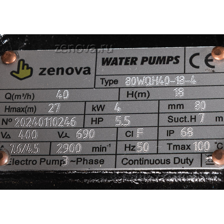 Дренажный погружной насос Zenova 80WQH-40-18-4 (Китай) может перекачивать горячую воду температурой до +80°C и до +105 °C кратковременно. Модель выпускается с июля 2023 года. Уникальные способности насоса долго работать в настолько горячей воде обусловлены специально разработанной конструкцией.