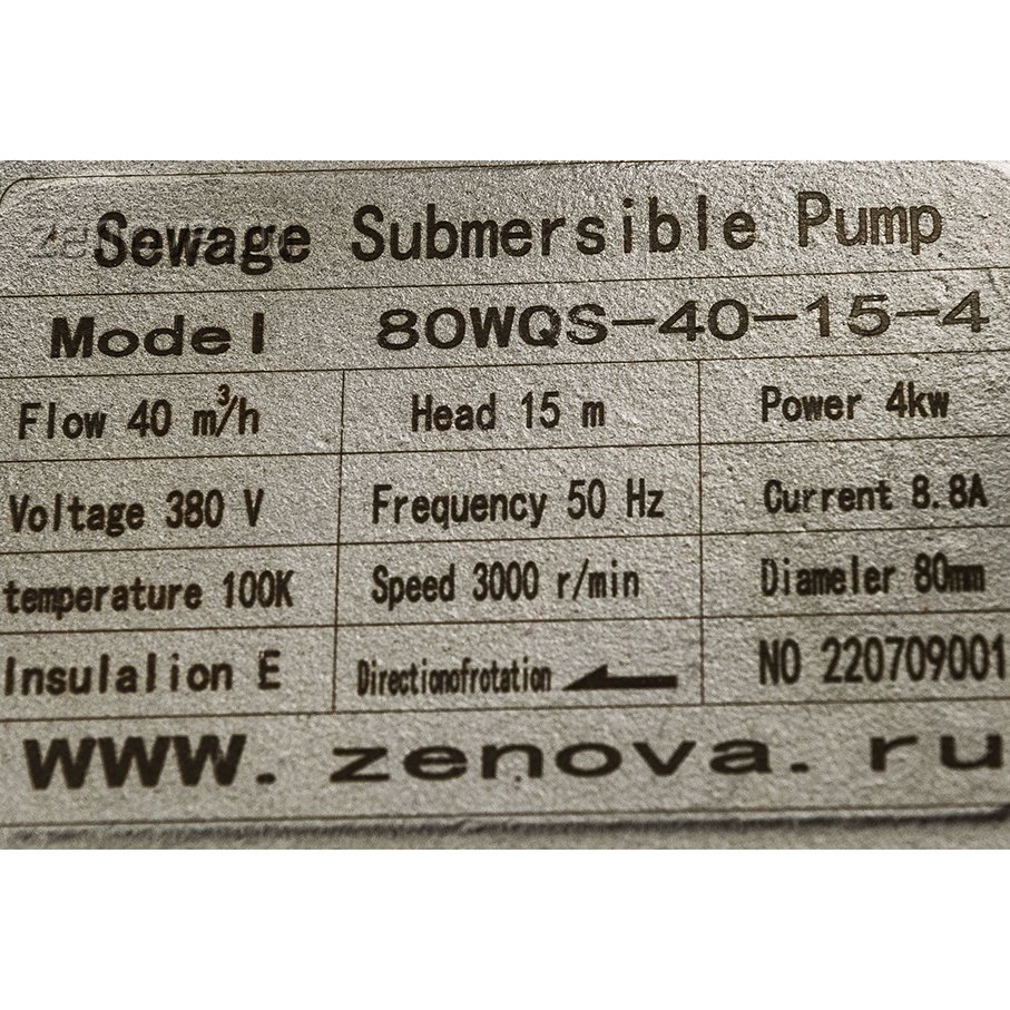 На насосе установлен трехфазный электродвигатель мощностью 4,0 кВт, питающее напряжение 380 В, скорость 2900 об/мин. Степень защиты IP68.