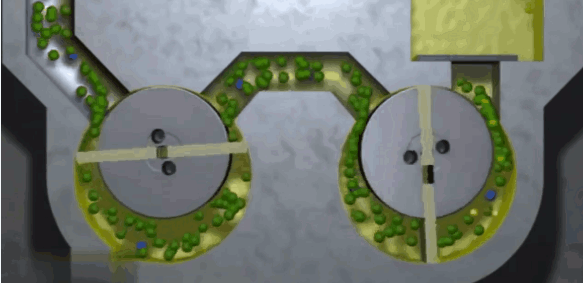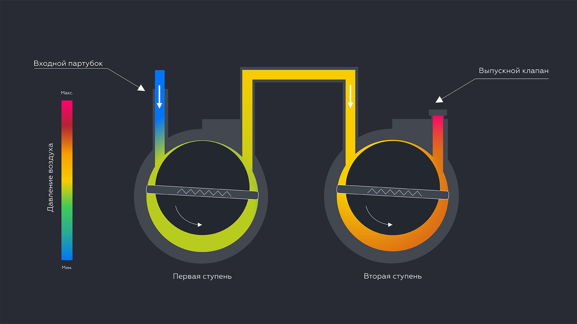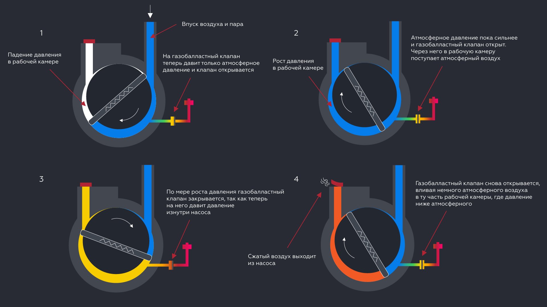 Когда лопатка первой камеры проходит мимо входного патрубка, вакуумируемый газ затягивается в первую камеру, где происходит его первичное сжатие. Предварительно сжатый газ затягивается во вторую камеру, где его давление и повышается до атмосферного.