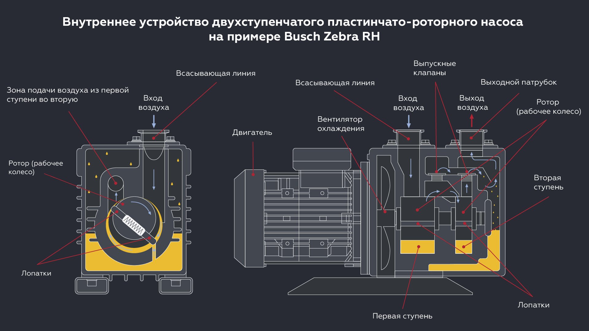 Рис. 2: внутреннее устройство двухступенчатого пластинчато-роторного насоса на примере Busch Zebra RH