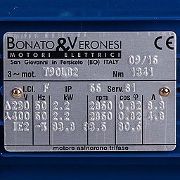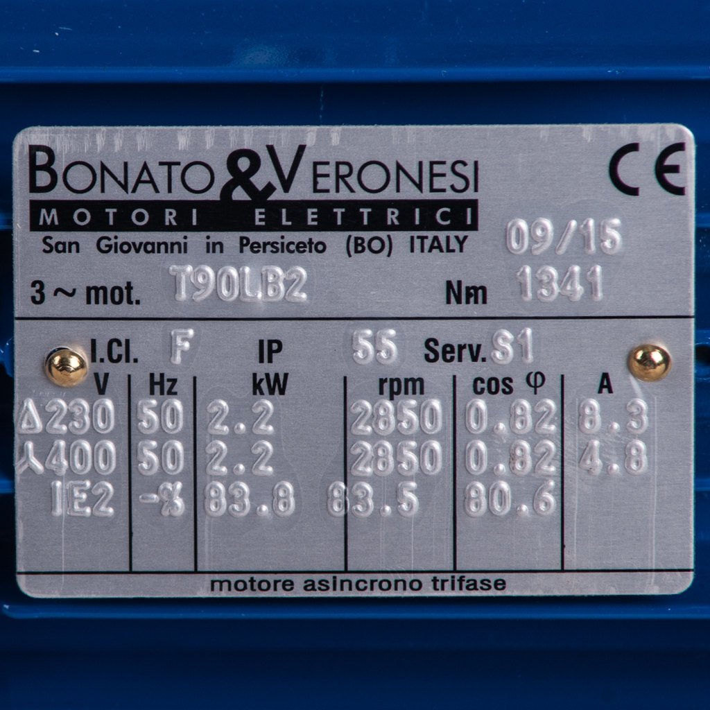 Приводом насоса служит двигатель 2,2 кВт, 3 фазы, 220 В/380 В (Δ /Y), 50 Гц, 2P, 2900 об/мин, I.Cl. F, IP55, Serv. S1.