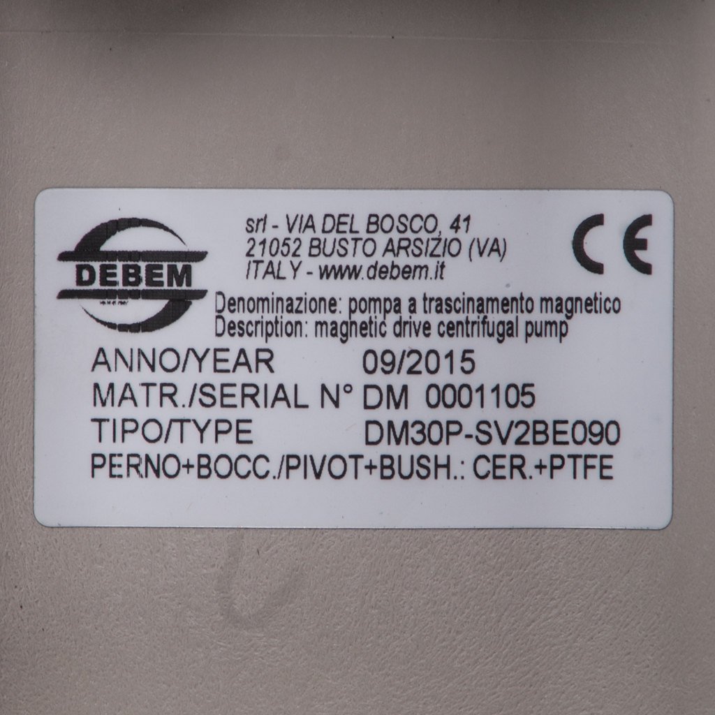 Центробежный насос с магнитной муфтой Debem DM30P-SV2BE090 в корпусе из полипропилена, служит для перекачивания химически активных сред плотностью до 1400 кг/м3 (1,4 кг/дм3), вязкостью до 150 сСт. Насос обеспечивает полную герметичность без риска утечки, температурные параметры перекачиваемой среды от +3 до +65 °C.
