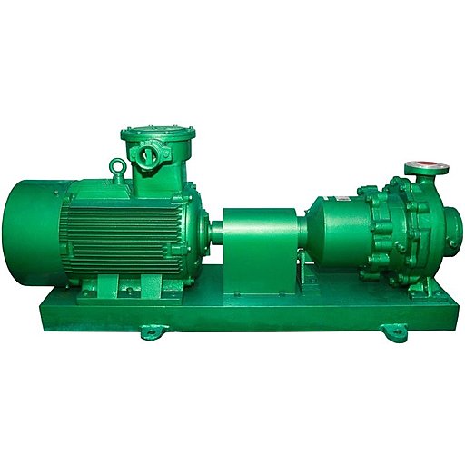 Герметичный химический насос ГХН 25/32.1 с магнитной муфтой позволяет перекачивать различные агрессивные жидкости. Корпус насоса выполнен из углеродистой стали, а проточная часть насоса футерована полимером (как правило, фторопластом Ф-50) толщиной 5-10 мм. Насосная часть и электродвигатель установлены на раме и соединяются посредством полумуфты.