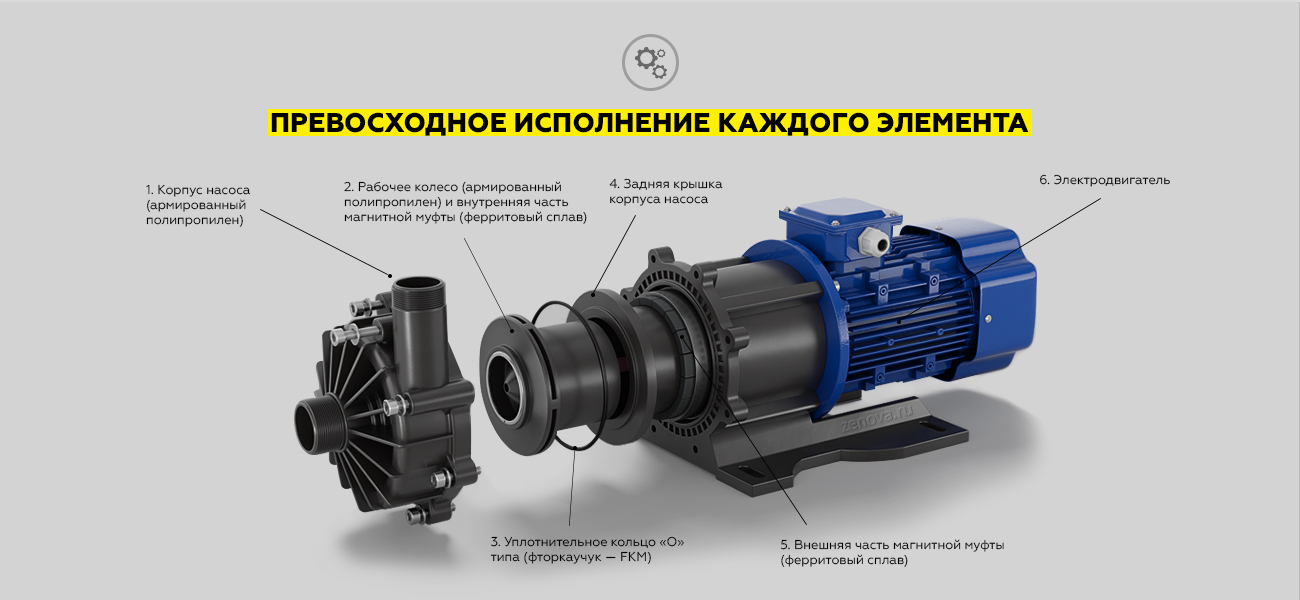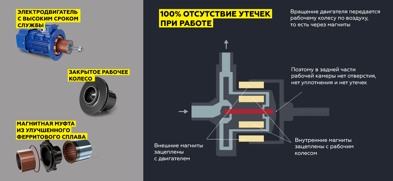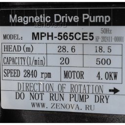 Герметичный насос c магнитной муфтой Zenova MDP-565-380 из полипропилена способен перекачивать химические растворы, жидкости плотностью до 1200 кг/м3, температурой от 0 до +80 °C (при продолжительной работе до +60 °C). Насос имеет простую, компактную конструкцию, магнитная муфта обеспечивает 100% защиту от утечки жидкости.