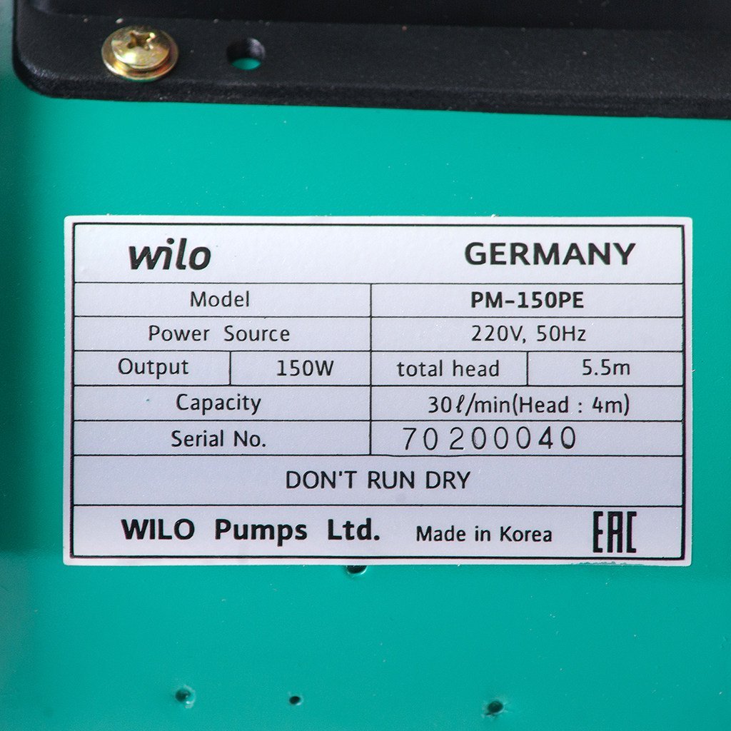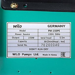 Насос PM-150PE оснащен конденсаторным электродвигателем выходной мощностью 150 Вт (0,15 кВт).