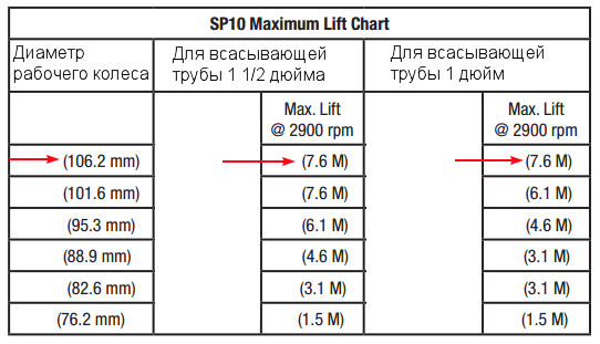Рисунок 2. Время самовсоса насоса SP10 зависит от диаметра рабочего колеса, высоты самовсоса и диаметра всасывающей трубы. Для SP10P-B-85 (диаметр рабочего колеса 106 мм) чем меньше высота подъема и чем меньше диаметр трубы, тем быстрее произойдет заполнение всасывающей линии.