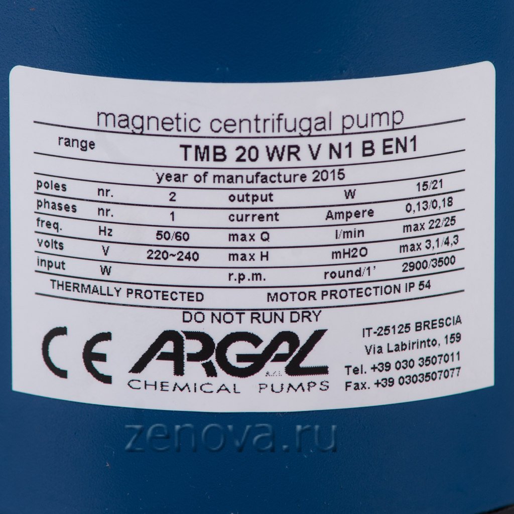 Химический насос Argal TMB 20 относится к малой серии насосов с магнитной муфтой, рассчитанной на небольшую производительность. Корпус насоса выполнен из полипропилена, армированного стекловолокном. Насос TMB 20 обеспечивает производительность от 0,1 до 1,4 м3/час (от 1,6 до 23,3 л/мин) и напор до 3 метров.