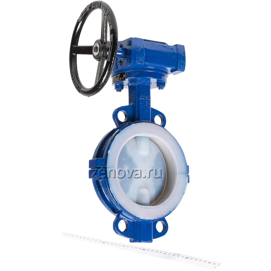Поворотный затвор с защитной футеровкой FEP используется в трубопроводах по разливу агрессивных сред, кислот, щелочей и растворителей. Затвор имеет стандартные фланцы. Рассчитан на номинальное давление не более 1,6 МПа или 16 атмосфер. Условный проход 150 мм или 6 дюймов. Фторопласт FEP подходит для большинства промышленных задач, но все же перед покупкой лучше проверить его совместимость с перекачиваемыми растворами по таблицам химической совместимости.