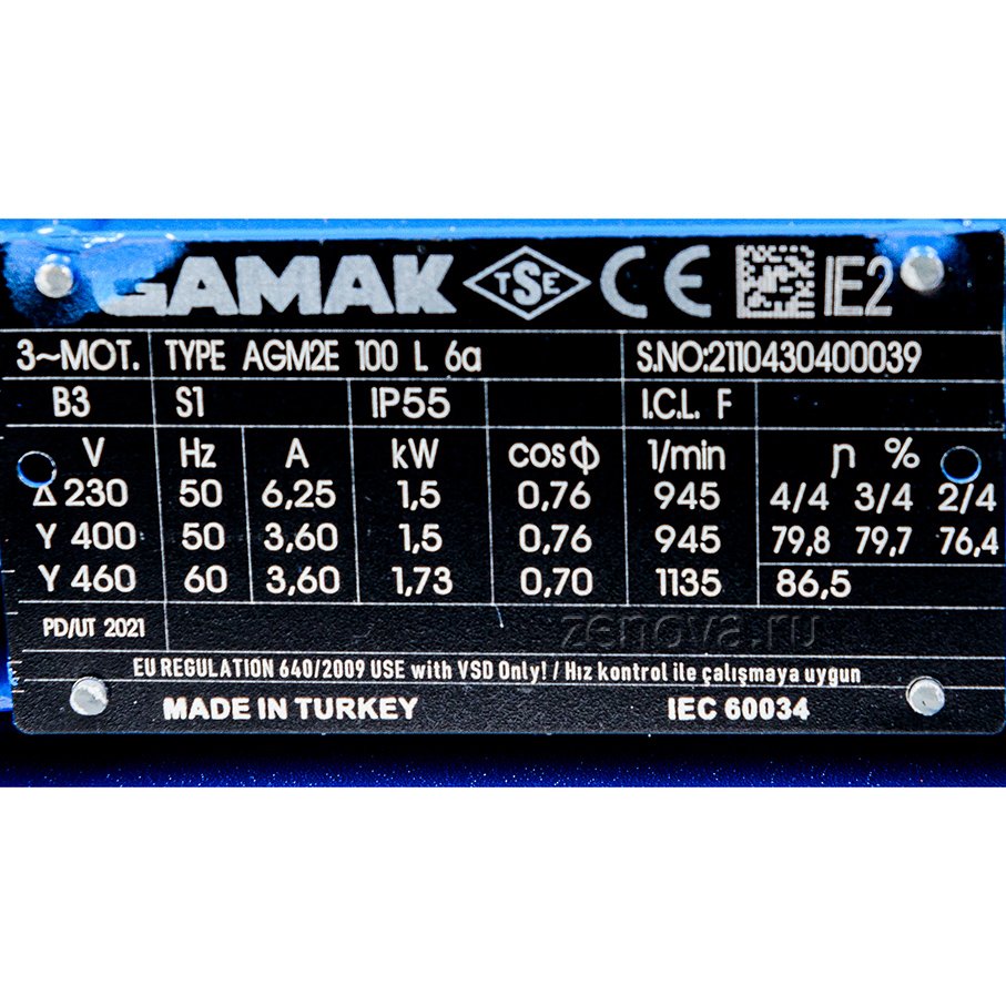 Насос оснащен трехфазным двигателем 380 В, мощностью 1,5 кВт, 6Р, частота вращения 900 об/мин.