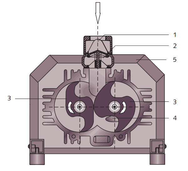Изображение 1. Внутреннее устройство Busch Mink. Цифрами на схеме показаны: 1) впуск воздуха, 2) обратный клапан, 3) рабочие кулачки-когти, 4) выпуск воздуха, 5) шумоизолирующий кожух.