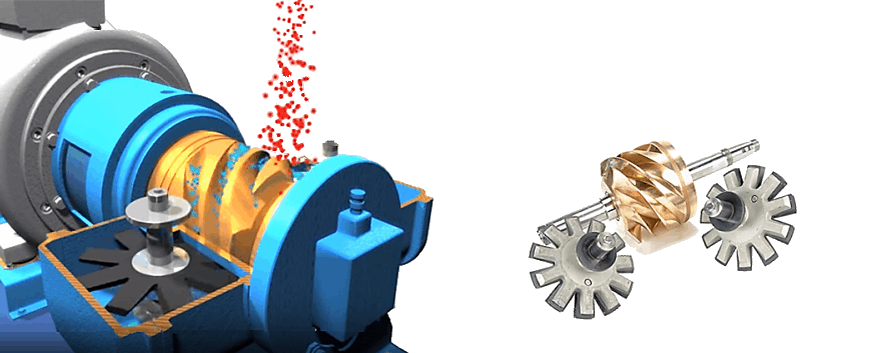 Основой механизма сжатия в DH-компрессоре является одновинтовой элемент в виде одиночного главного ротора (винта), который шестью своими бороздками зацепляется с двумя 11-зубцовыми ведомыми роторами. Воздух сжимается в двух камерах, размещенных сверху и снизу главного винта, сжимающие нагрузки балансируются и в значительной степени уменьшается воздействие на необслуживаемые герметичные подшипники. В итоге увеличивается срок эксплуатации винтового блока и существенно уменьшаются эксплуатационные затраты.