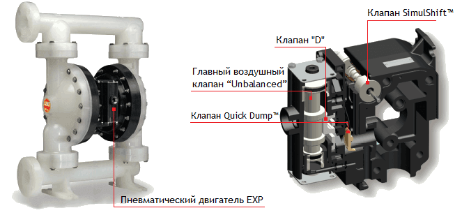Пневмодвигатель насосов состоит из нескольких компонентов, каждый из которых выполняет свою функцию: