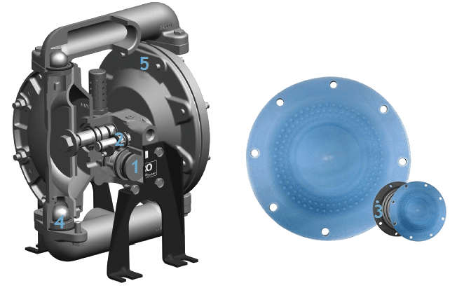 Во втором варианте мембраны имеют сдвоенную конструкцию: диск мембраны со стороны жидкости всегда выполнен из тефлона (PTFE), а диск с пневматической стороны из сантопрена.