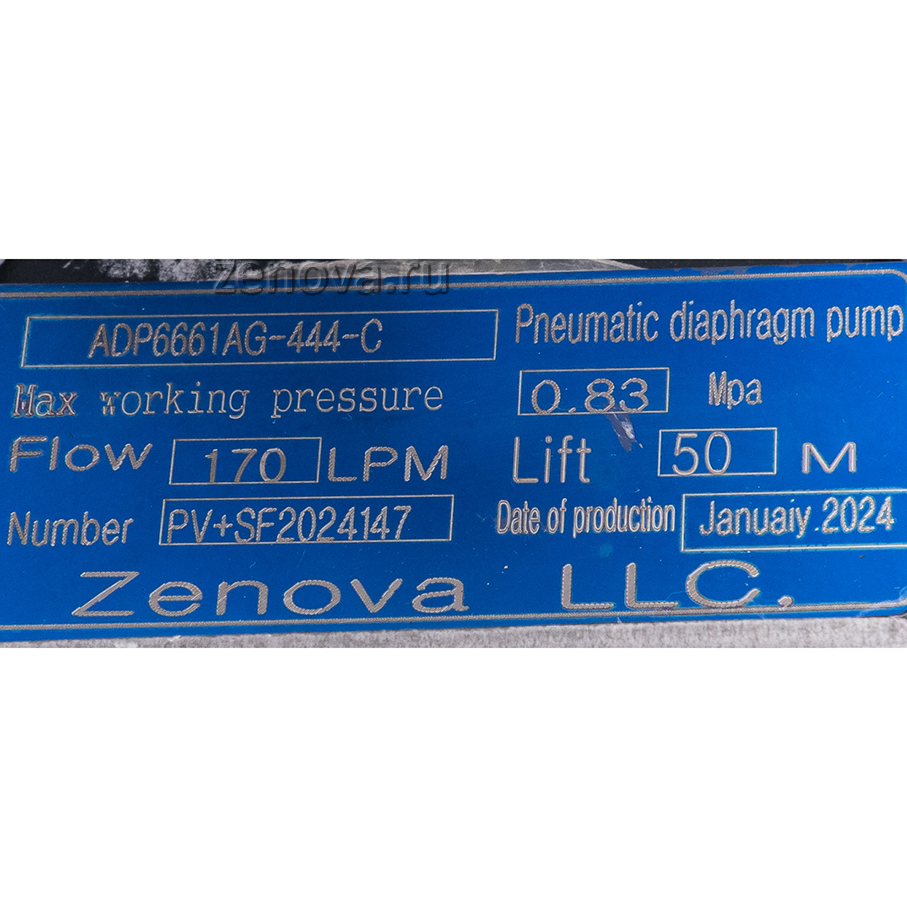 Мембранный пневматический насос Vetlan Pneumatic ADP-6661AG-444-C перекачивает в режиме самовсасывания жидкости и вязкие среды разнообразной химической структуры, в том числе с твердыми фракциями до 3,2 мм. Для работы насоса необходима подача сжатого воздуха с давлением до 8,3 бар.