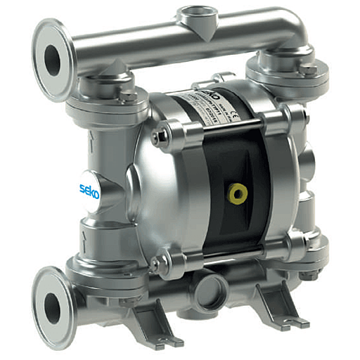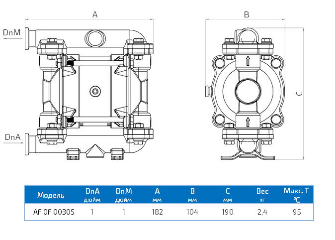 Мембранный пневматический насос Duotek Food AF 0F 0030S из полированной нержавеющей стали AISI 316 служит для перекачки продуктов пищевой промышленности. Он совместим с кисломолочными, растительными, сахаросодержащими и спиртосодержащими жидкостями, с моющими и дезинфицирующими растворами. Насос питается от источника сжатого воздуха давлением до 8 бар, позволяет перекачивать жидкости с температурой до 95 °C, среды с твердыми частицами диаметром 3.5 мм, продукты вязкостью до 15 000 сСт (20 °C).