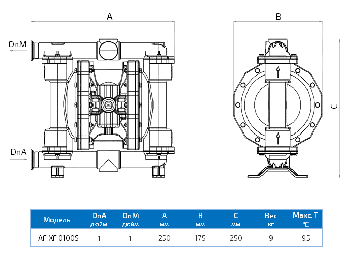 Мембранный пневматический насос Duotek Food AF XF 0100S из полированной нержавеющей стали AISI 316 служит для перекачки продуктов пищевой промышленности. Он совместим с кисломолочными, растительными, сахаросодержащими и спиртосодержащими жидкостями, с моющими и дезинфицирующими растворами. Насос питается от источника сжатого воздуха давлением до 8 бар, позволяет перекачивать жидкости с температурой до 95 °C, среды с твердыми частицами диаметром 3.5 мм, продукты вязкостью до 25 000 сСт (20 °C).