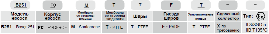 Корпус насоса BOXER 251-F выполнен из фторопласта (PVDF+CF). Мембраны сдвоенной конструкции Santoprene+PTFE: внутренняя мембрана со стороны воздуха из сантопрена, внешняя мембрана со стороны жидкости из тефлона. Шариковые клапана из тефлона, седла клапанов из фторопласта, прокладки и уплотнительные кольца из тефлона.