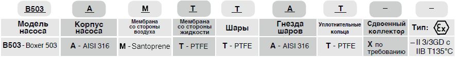 BOXER 503-A - это условное название модели, полный артикул насоса IB503A-MTTATI--, он содержит информацию о материалах элементов конструкции.