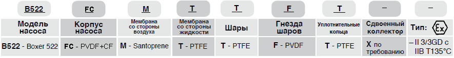 Корпус насоса BOXER 522-F выполнен из фторопласта (PVDF+CF). Мембраны сдвоенной конструкции Santoprene+PTFE: внутренняя мембрана со стороны воздуха из сантопрена, внешняя мембрана со стороны жидкости из тефлона. Шариковые клапана из тефлона, седла клапанов из фторопласта, прокладки и уплотнительные кольца из тефлона.